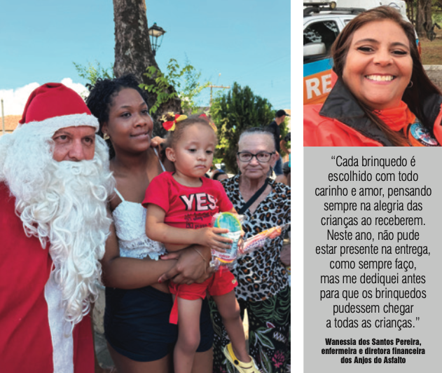 Saulo Monteiro Ferreira é condutor socorrista e diretor do grupo Anjos do Asfalto. Há 15 anos, ele participa da ação todo dia 25 de dezembro. “Na última ação, chegamos a arrecadar 500 brinquedos para serem distribuídos em cerca de seis pontos de parada. Eles vão para crianças das comunidades, das periferias, que, normalmente, ficam esperando esse momento. Nós chegamos à localidade, damos uma volta com a sirene ligada, e as crianças já sabem que o Papai-Noel chegou. Nós contamos com a ajuda da Polícia Militar e, quando é possível, de uma equipe do Samu”, detalha Ferreira.