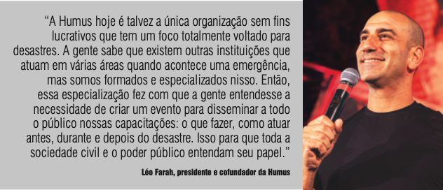“A Humus hoje é talvez a única organização sem fins lucrativos que tem um foco totalmente voltado para desastres. A gente sabe que existem outras instituições que atuam em várias áreas quando acontece uma emergência, mas somos formados e especializados nisso. Então, essa especialização fez com que a gente entendesse a necessidade de criar um evento para disseminar a todo o público nossas capacitações: o que fazer, como atuar antes, durante e depois do desastre. Isso para que toda a sociedade civil e o poder público entendam seu papel. Por isso, a realização desse seminário é tão importante, e a nossa ideia foi exatamente mostrar que todo mundo é capaz de ajudar a salvar vidas antes, durante e depois”, contextualiza Léo Farah,presidente e cofundador da Humus e especialista em gestão de crises, desastres e emergências.