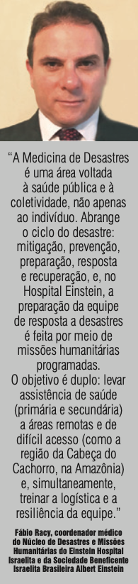 Também coordenador médico do Comitê de Prevenção e Resposta a Catástrofe do Einstein Hospital Israelita e da SBIBAE, doutor Fábio Racy conta que a equipe dá suporte à atenção primária existente e leva especialistas (atenção secundária) e, quando possível, realiza cirurgias (atenção terciária). Também busca deixar legados, como a introdução de telemedicina e a agilização de diagnósticos, a exemplo da entrega imediata de resultados de Papanicolau para mulheres indígenas.